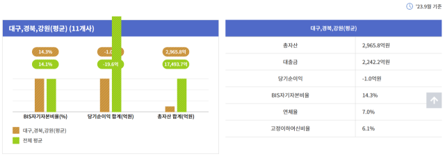 부실채권을 의미하는 고정이하여신(NPL) 비율은 대구·경북·강원 저축은행이 10.2%로 6개 권역에서 가장 높았고 경기·인천(8.8%), 광주·전남·전북(8.5%), 대전·충남·충북(8.4%), 부산·울산·경남(7.4%), 서울(7.2%)이 뒤를 이었다.