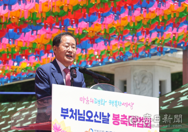 홍준표 대구시장이 15일 대구 동구 동화사에서 열린 '부처님 오신 날 봉축 대법회'에서 축사하고 있다. 안성완 기자 asw0727@imaeil.com