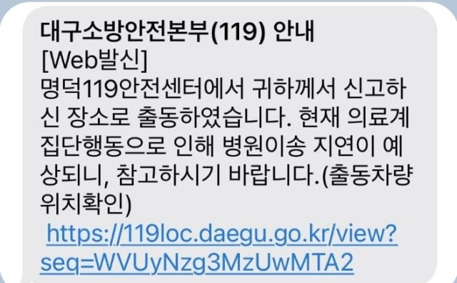 앞서 1일 임현택 의협 회장은 페이스북에 대구 소방안전본부는 신고자에게 보낸 메시지를 공개했다. 해당 메시지에는 신고한 장소로 출동했다고 안내하면서 '현재 의료계 집단행동으로 인해 병원이송 지연이 예상되니, 참고하시기 바란다'는 내용이 담겨 있었다.