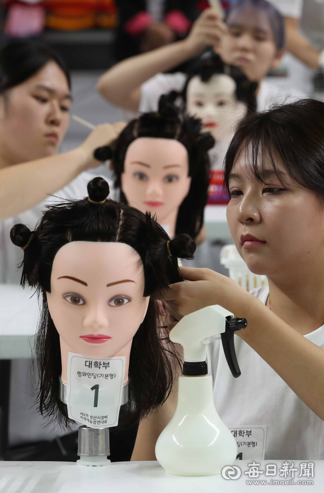 24일 경산실내체육관에서 열린 '제2회 경산시장배 미용경기대회'에서 펌와인딩 기본형 대학부에 출전한 참가자들이그동안 갈고닦은 기량을 뽐내고 있다.