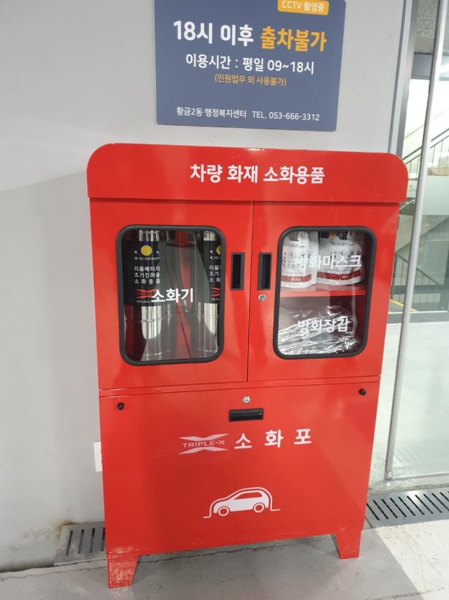 4일 태량에 따르면 경북도청은 전기차 충전기를 지상으로 이전 설치하면서 '스탠드 세트형 친환경 소화포'를 3곳에 설치해 전기차 화재 시 신속한 대응이 가능하도록 했다.