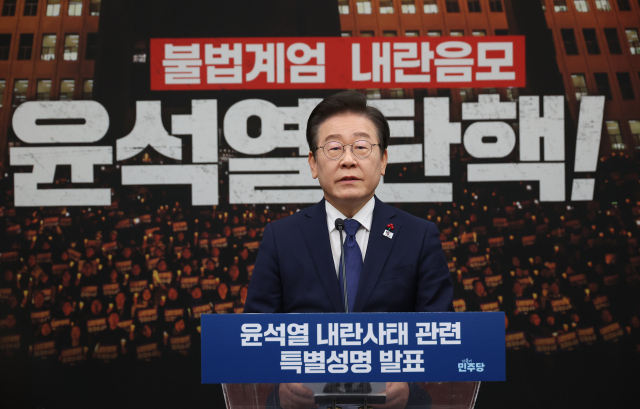 13일 이 대표는 당 대표 성명을 통해 "어제 대통령 윤석열은 국민을 향해 광기의 '선전포고'를 감행했다. 한시도 직무를 수행할 능력이 없음을, 한시도 직무를 수행해서는 안됨을 '셀프 인증'했다"며 "국민의 명령은 내란 수괴 윤석열은 지금 당장 물러나라는 것"이라고 말했다.