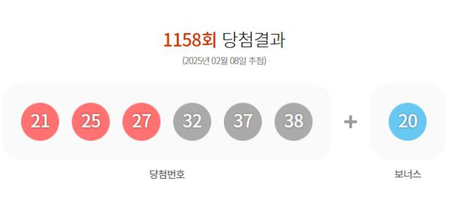 로또복권 운영사 동행복권이 제1158회 로또복권 추첨에서 '21, 25, 27, 32, 37, 38'이1등 당첨번호로 뽑혔다고 8일 밝혔다.
