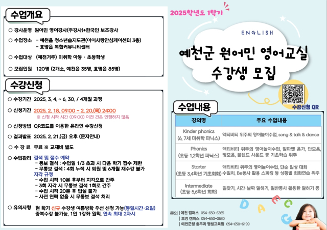 경북 예천군은 2025학년도 1학기 원어민 영어교실 프로그램을 다음달 4일부터 6월 30일까지 4개월간 운영한다.