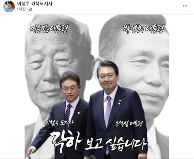 이철우 경북도지사가 자신의 SNS에 "각하 보고 싶습니다"라는 내용과 함께 이승만·박정희 전 대통령 및 윤석열 대통령의 사진을 올려 구설에 올랐다.