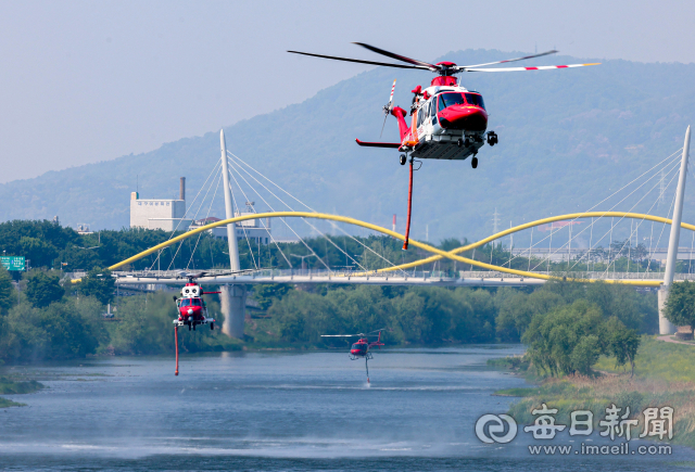 대구에서 발생한 대형 산불이 이틀 만에 진화 완료된 29일 대구 북구 산불 현장에서 헬기들이 잔불 진화를 위해 분주히 움직이고 있다. 안성완 기자 asw0727@imaeil.com