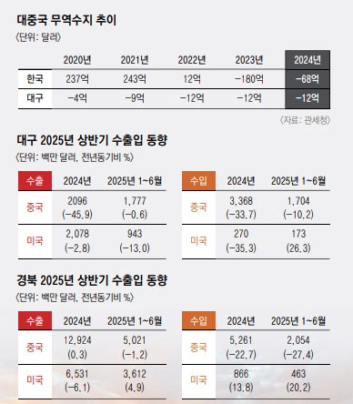 경제 지표 악화는 수출 부진과 밀접한 연관을 지닌다. 한국무역협회 대구경북지역본부 '2025년 상반기 수출입 평가 및 하반기 전망 보고서'를 보면 대구의 수출은 전년 동기 대비 6.2% 감소한 44억2천만 달러, 경북은 3.4% 감소한 180억6천만 달러로 집계됐다. 철강, 알루미늄 등에 대한 품목 관세 부과로 대(對)미 수출이 줄어든 영향으로 풀이된다.