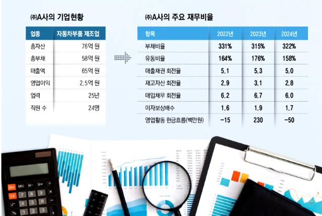 최씨는 올해로 업력이 25년이다. 앞만 보고 달려왔지만 최근에는 경기침체와 대출이자가 걱정이다. 매출액은 발로 더 뛰면 된다지만, 재무구조 개선은 최씨가 잘 알지도 못하는 분야로 그냥 손을 놓고 있던 참이다. ㈜A사의 2024년 매출액은 약 65억원, 영업이익은 2억5천만원이다. 최근 경기침체로 영업이익도 떨어졌다. 연간 대출이자 1억4천만원과 법인세를 내고 나면 당기순이익은 그다지 높지 않다. 2024년 기준 총자산 76억원, 총부채 58억원에 순자산은 18억원이다. 은행대출금은 30억원이다.