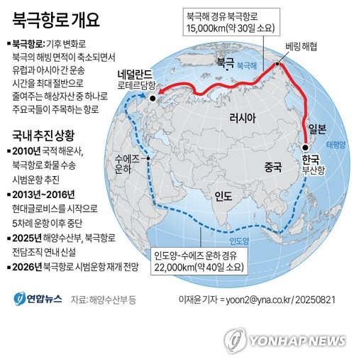 도에 따르면 북극항로는 북극해를 따라 러시아 북부를 지나 유럽으로 향하는 새로운 해상 운송로다. 기존의 인도양~수에즈 운하를 통과하는 항로에 비해 거리가 3분의 2로 줄어든다. 물류비 절감 효과가 커 글로벌 해운 업계의 관심도 크다.