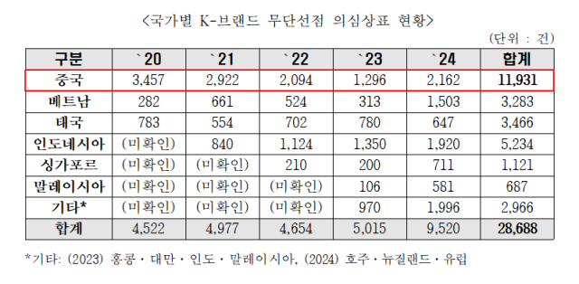 일단 브랜드 무단 선점 피해 의심 사례만 지난 5년간 총 2만8천688건에 이르는 것으로 나타났다. 브랜드 무단 산점이란 특정 국가산 유명 브랜드를 누군가가 제3국에 자신들의 브랜드인 것처럼 선점 등록하는 '브랜드 약탈 행위'를 일컫는다. 3만 개에 육박하는 한국 브랜드가 이런 약탈 행위로 몸살을 앓아온 것이다.