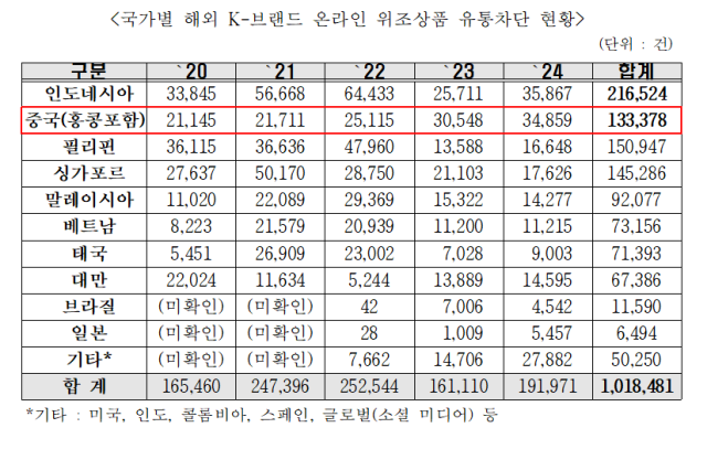 이른바 '짝퉁' 피해도 폭발적으로 늘고 있다. 특허청의 '온라인 위조상품 유통차단 현황'을 살펴보면 최근 5년 간 짝퉁 상품 피해는 총 101만8천481건에 이르렀다. 5년 간 무려 6배나 늘어난 수치다. 국가별로 살펴보면 인도네시아가 21만6천524건으로 1위, 중국이 13만3천378건으로 그 뒤를 이었다.