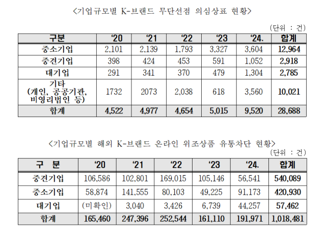 1일 국회 산업통상자원중소벤처기업위원회 소속 구자근 국민의힘 의원이 특허청으로부터 제출받은 '최근 5년 간 한국 브랜드에 대한 국외 무단선점 상품과 위조상품 유통차단 현황'에 따르면 한국 기업의 피해가 심각한 수준인 것으로 나타났다. 특히 중소기업 피해가 심했다.