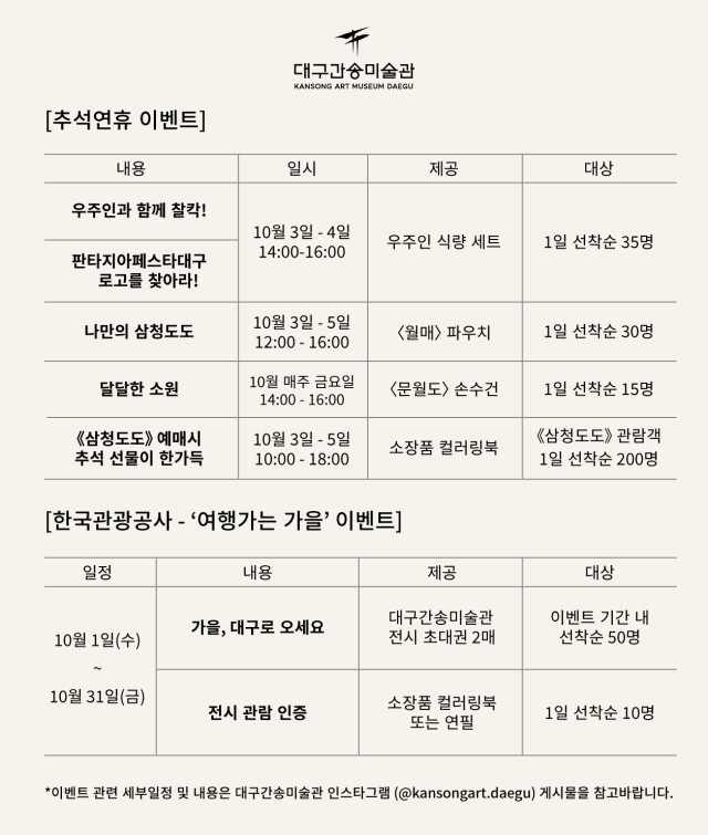 이외에 추석 연휴 기간 ▷포토 카드를 이용해 나만의 삼청첩을 만드는 SNS 이벤트 '나만의 삼청도도' ▷판타지아 대구 페스타와 연계한 '우주인과 찰칵 이벤트 ▷판대페 로고를 찾아라 등 선착순 기념품 증정 이벤트가 이어진다. 이벤트 진행 일정과 참여 방법에 대한 자세한 내용은 대구간송미술관 인스타그램 등을 통해 확인할 수 있다.