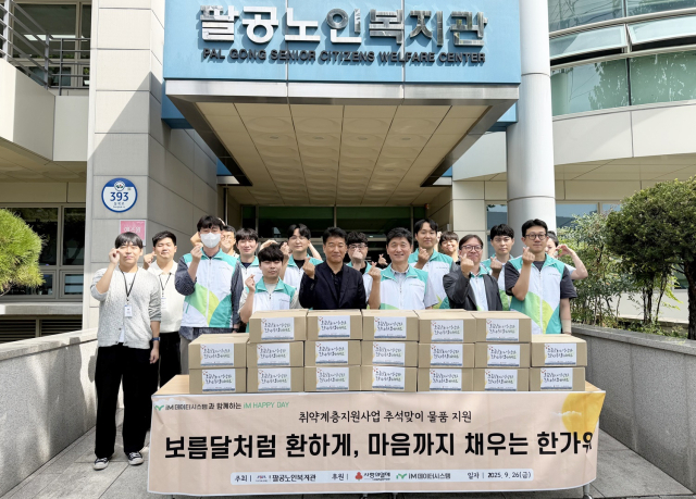 iM금융그룹 계열사인 iM데이터시스템(대표이사 유충식)은 지난달 26일 대구 동구 소재 팔공노인복지관(관장 이창환)에서 추석 맞이 '9월 iM HAPPY DAY' 및 기부금 전달식을 진행했다.