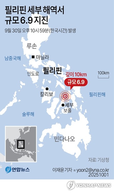 미국 지질조사국(USGS)에 따르면 30일(현지시간) 오후 9시 59분 필리핀 세부섬 북부 해안도시인 보고시에서 북동쪽으로 약 19㎞ 떨어진 해상에서 규모 6.9의 강진이 발생했다. 진앙은 북위 11.15도, 동경 124.14도이며 지진 발생 깊이는 10km다.