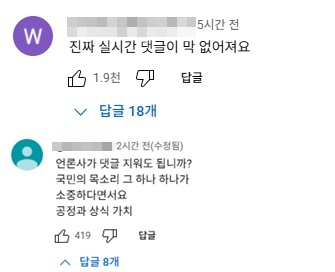 일부 시청자들은 댓글 삭제 의혹을 제기하기도 했다. 한 이용자는 "화재 이후 스스로 생을 마감한 공무원의 명복을 빈다는 댓글에 좋아요 2200개를 받았었는데, 지금은 삭제됐다"고 주장했다. 또 다른 이는 "나는 지운 적이 없는데 댓글이 자꾸 삭제된다"고 적었다. 또 "댓글 지우느라 바쁘다 바빠" "댓글 삭제가 왜 이렇게 많죠" "실시간 댓글이 막 없어져요" "댓글 제대로 보시려면 최신순으로 보셔야 한다" 등의 의견도 있었다.