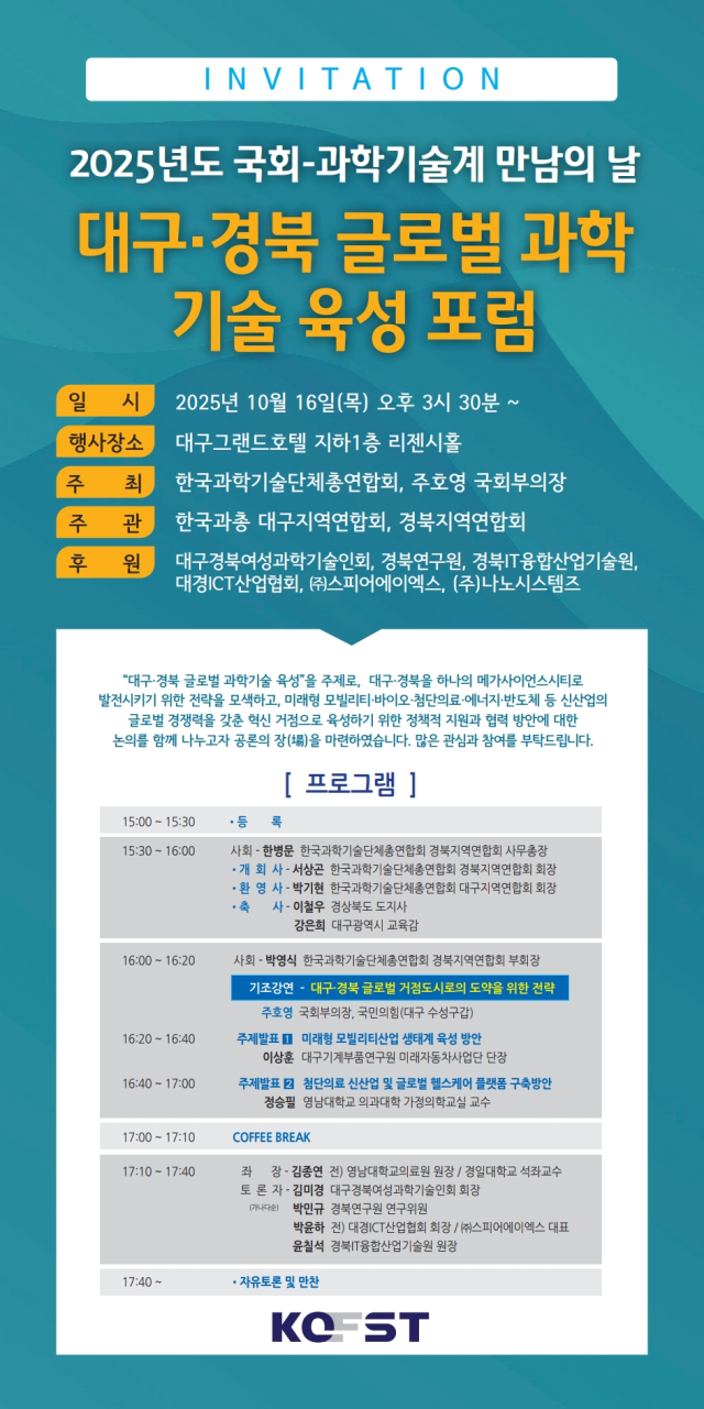 '2025년도 국회-과학기술계 만남의 날, 대구·경북 글로벌 과학기술 육성 포럼'이 오는 16일 오후 대구그랜드호텔 리젠시홀에서 열린다.