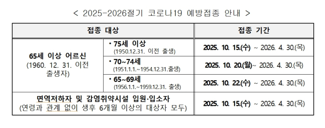 생후 6개월 이상 면역저하자와 감염취약시설 입원입소자, 75세 이상 어르신은 오는 15일부터 접종받을 수 있으며, 대상자가 한꺼번에 몰리는 것을 방지하기 위해 고연령층 중 70~74세는 20일부터, 65~69세는 22일부터 단계적으로 접종을 한다.