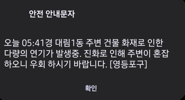 영등포구는 "화재로 인한 다량의 연기가 발생 중. 진화로 인해 주변이 혼잡하니 우회하시기 바란다"는 안전 안내문자를 보냈다.