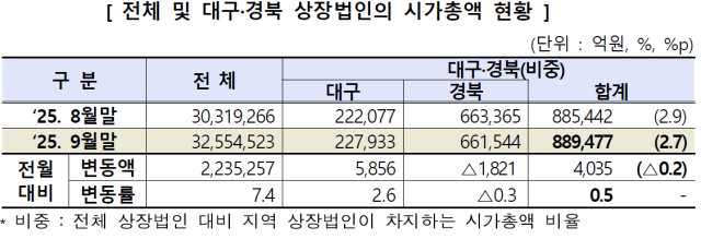 대구·경북 상장법인의 시가총액이 9월 말 기준 88조9천477억 원으로 집계됐다. 전월 대비 0.5%(4천35억 원) 증가한 수치로, 반도체를 중심으로 한 전기·전자 업종과 운송·비금속 업종의 상승이 지역 증시를 견인했다.