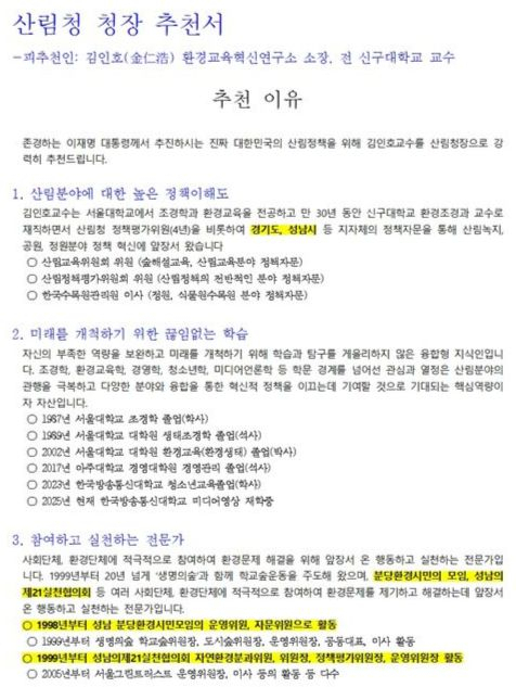 김 청장은 이재명 정부가 운영한 공직자 국민추천제 게시판에 "존경하는 이재명 대통령께서 추진하시는 진짜 대한민국의 산림정책을 위해 김인호 교수를 산림청장으로 강력히 추천드립니다"라고 적었다.