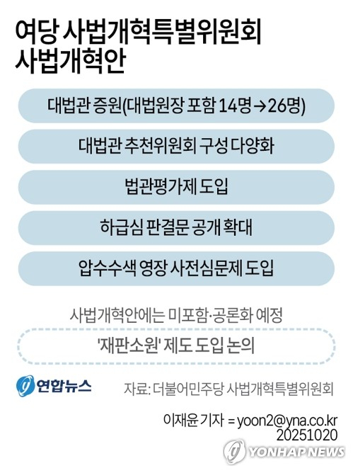 더불어민주당이 20일 현재 14명인 대법관을 26명으로 늘리는 것을 핵심으로 하는 '사법개혁안'을 발표하고 입법 작업에 착수했다. 야당은 대통령의 사법리스크 해소를 위해 정부·여당이 사실상 사법부를 장악하려는 시도라며 강하게 반발했다.