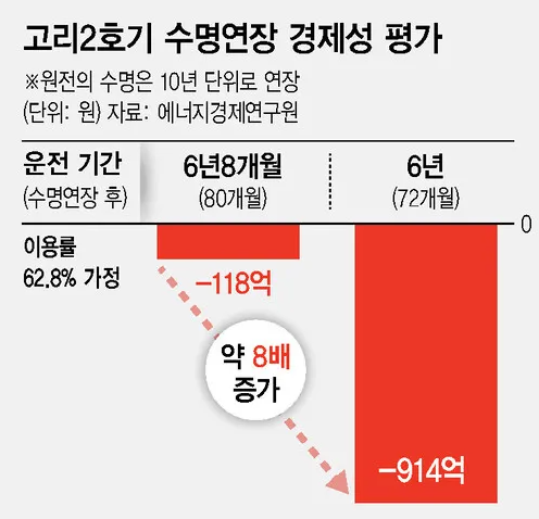 4일 국회 산업통상자원중소벤처기업위원회가 한국수력원자력(한수원)을 거쳐 에경연으로부터 제출 받은 '고리2호기 계속운전 경제성 평가 보고서'에 따르면 고리2호기의 계속운전이 허가돼 이제껏 해왔듯 80개월 운행할 경우 1천619억원 이익이 발생하는 것으로 나타났다. 기준이 80개월인 이유는 고리2호기 설계수명 만료일인 2023년 4월로부터 10년으로 제한되는 법 구조상 남은 시간이 80개월 정도뿐이기 때문이다.