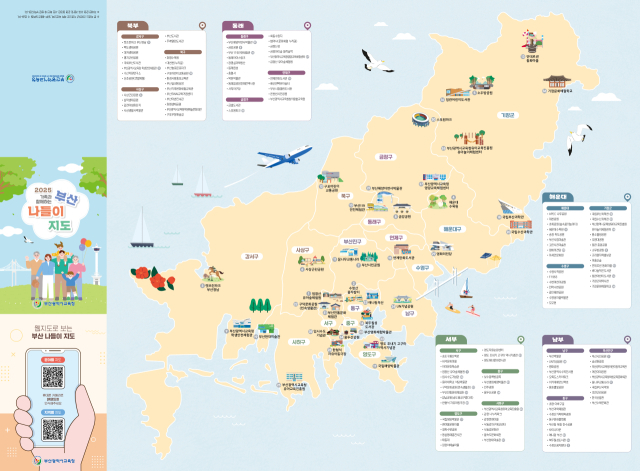'가족과 함께하는 부산 나들이 지도'는 영유아 자녀와 함께 방문하기 좋은 부산의 나들이 장소를 지역별, 분야별(자연, 체험, 문화 등)로 소개한 자료로, 가정에서 활용하기 쉽도록 지도 형태로 제작됐다.