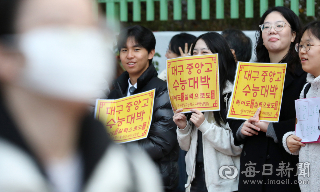 대구여고 시험장 앞에서 중앙고 후배들이 '수능대박' 피켓을 들고 선배 수험생들을 응원하고 있다.