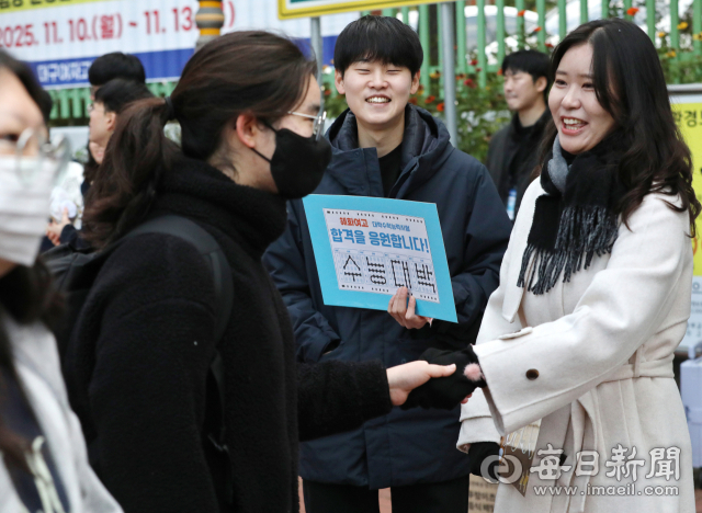 2026학년도 대학수학능력시험이 치러진 13일 오전 대구 수성구 대구여자고등학교 시험장 앞에서 혜화여고 교사들이 수험생들에게 응원의 악수를 건네며 '수능 대박'이라고 적힌 피켓을 들고 격려하고 있다. 정운철 기자 woon@imaeil.com