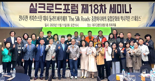 실크로드포럼 제18차 세미나가 지난 11일 대구그랜드호텔 프라자홀에서 열렸다. 이날 초빙강사인 둘라트 바키세프 전 주한 카자흐스탄 대사는 '중앙아시아의 융합문화와 역사적인 르네상스'를 주제로 강연했다. '실크로드포럼'은 영남대 글로벌평생교육원에 개설된 박순국의 실크로드 과목을 수료한 사람들의 후속공부 모임이다.