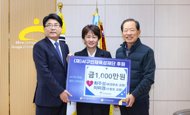최주성 전 경운초 교장과 이미경 수창초 교장은 지난 12일, 지역 교육 발전과 인재 양성을 위해 서구청(구청장 류한국)을 방문해 (재)서구인재육성재단 후원금으로 1천만원을 기탁했다.