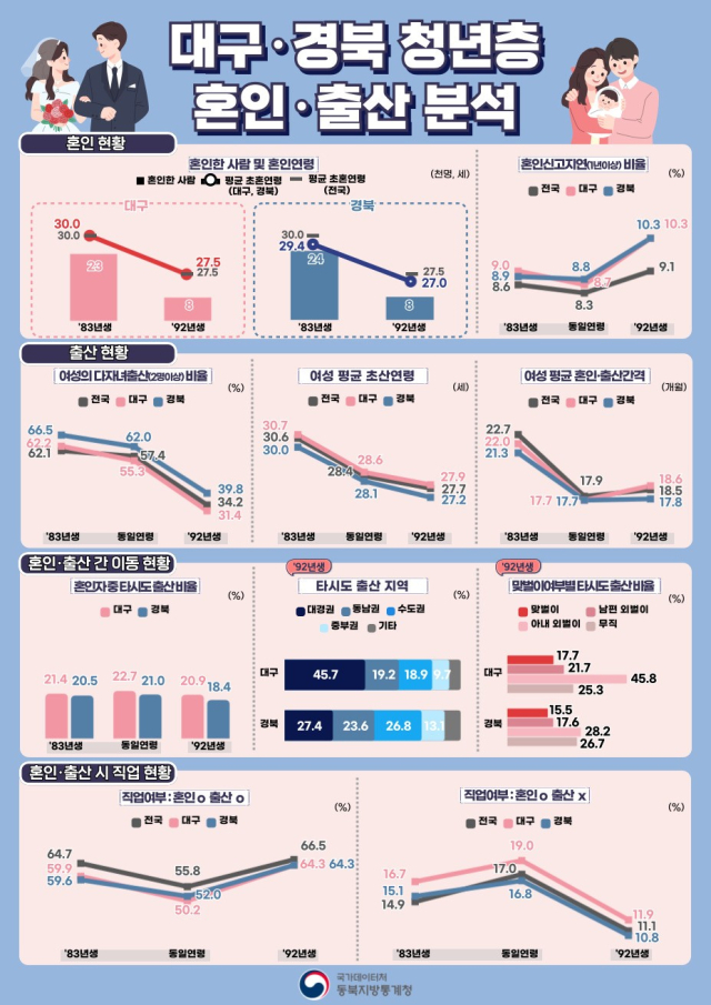 18일 동북지방통계청이 발표한 '대구경북 청년층 혼인·출산 분석' 자료에 따르면 지난 2023년 기준 1992년생(당시 만 31세) 기혼자의 평균 초혼연령은 대구 27.5세, 경북 27.0세로 집계됐다. 1983년생(만 40세) 중 혼인한 사람의 평균 초혼연령은 대구 30.0세, 경북 29.4세였다.