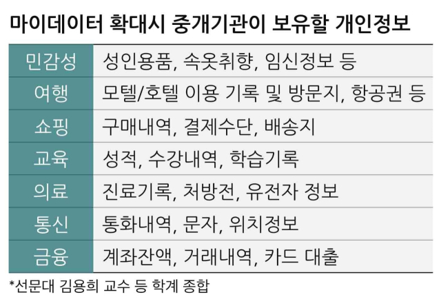 성인용품 구매 이력부터 임신 진료 기록, 학교 성적까지. 정부가 추진 중인 '마이데이터' 전면 확대 정책이 현실화되면, 이처럼 민감한 정보까지 특정 중개기관에 고스란히 넘어갈 수 있다는 우려가 벤처업계를 중심으로 제기되고 있다.