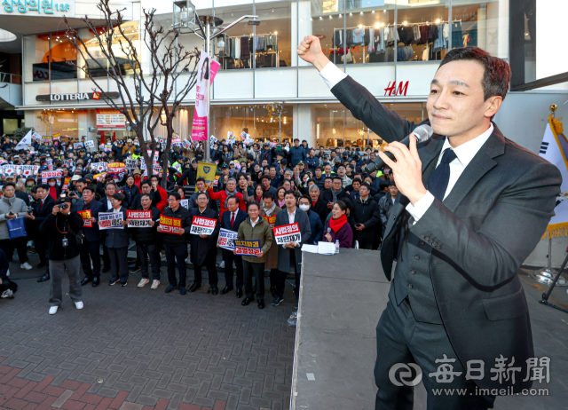김민수 국민의힘 최고위원이 28일 오후 대구 중구 동성로에서 열린 '민생회복 법치수호 대구 국민대회'에서 연설하고 있다. 안성완 기자 asw0727@imaeil.com