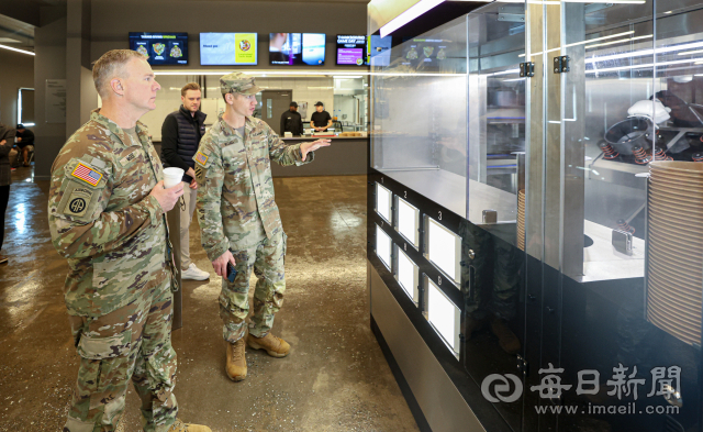 28일 대구 남구 주한미군 제19 지원사령부 캠프 워커 내 설치된 자동화 식당 '마켓 19'에서 미군들이 로봇이 조리하는 모습을 바라보고 있다. 이 식당은 미 육군 최초의 자동화 식당으로 이달부터 6개월 동안 시범 운영한다. 안성완 기자 asw0727@imaeil.com