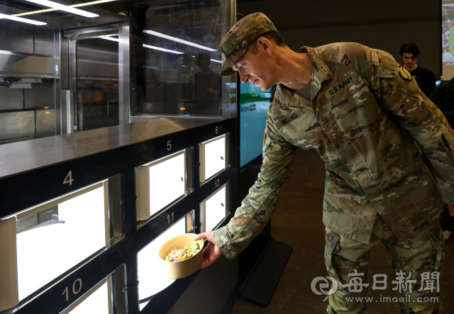 28일 대구 남구 주한미군 제19 지원사령부 캠프 워커 내 설치된 자동화 식당 '마켓 19'에서 한 미군이 로봇이 조리한 급식을 받고 있다. 이 식당은 미 육군 최초의 자동화 식당으로 이달부터 6개월 동안 시범 운영한다. 안성완 기자 asw0727@imaeil.com