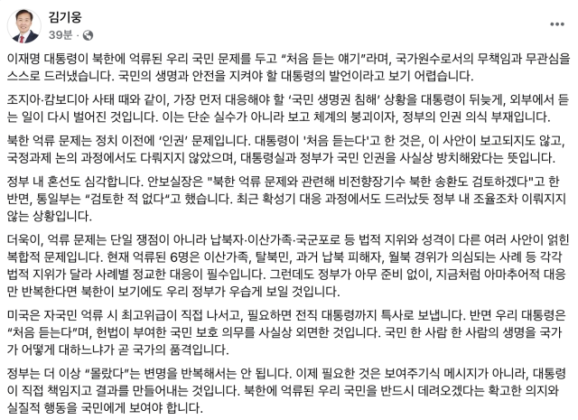 이재명 대통령이 지난 3일 외신 기자회견에서 북한에 억류 중인 우리 국민의 석방 관련 질문에 "처음 듣는 이야기"라고 답한 것에 대해 국민의힘 김기웅 의원(대구 중·남구)이 쓴소리를 내놨다.