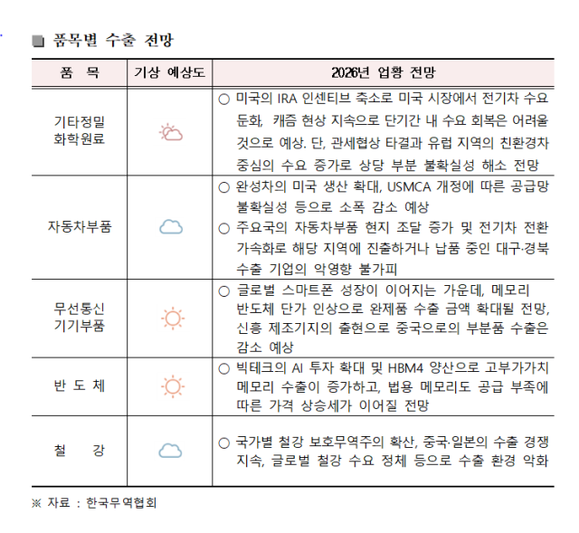 권오영 한국무역협회 대구경북지역본부 본부장은 "올해는 지역 기업에 매우 힘든 한 해였지만 신산업 분야에서 두각을 드러낸 일부 품목이 선방하는 모습을 보였다. 내년에도 전 세계적인 통상 리스크에 따른 업종별 대응 전략이 중요하다"고 했다.