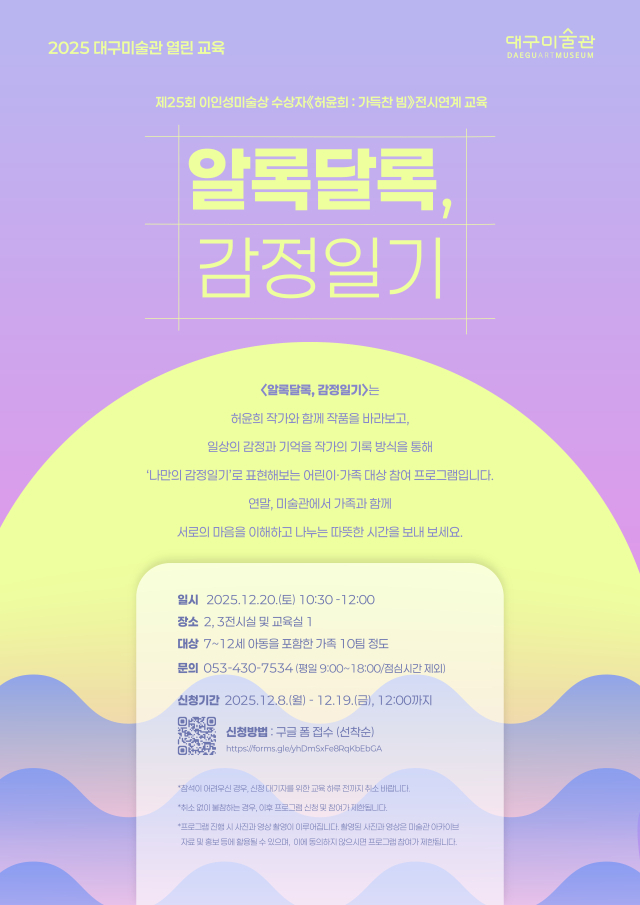 7~12세 아동을 포함한 가족 10팀을 대상으로 진행되며, 12월 19일 정오까지 구글폼 선착순 예약을 통해 신청할 수 있다. 053-430-7534.
