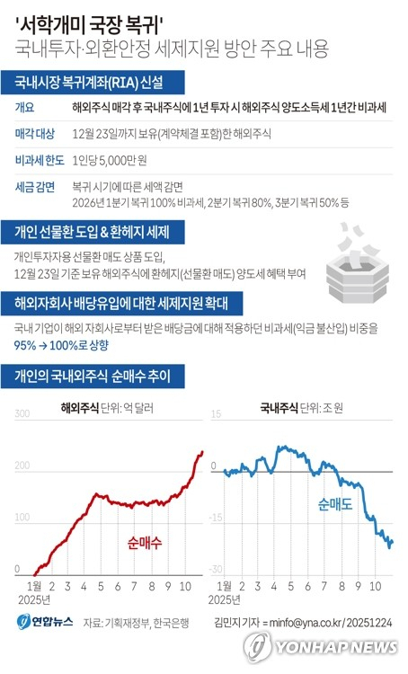 기획재정부와 한국은행은 24일 서울 외환시장 개장 직후 "원화의 과도한 약세는 바람직하지 않다"는 구두개입 메시지를 내놨다. 이어 기재부는 '국내투자·외화안정 세제지원 방안'을 발표했다. 대책의 첫 축은 '국내시장 복귀계좌(RIA)' 신설이다. 12월 23일 기준 보유한 해외주식을 매각해 RIA를 통해 국내 주식이나 주식형 펀드에 1년간 투자하면 해외주식 양도소득세(20%)를 한시적으로 면제한다. 1인당 한도는 5천만원이며, 내년 1분기 복귀 시 100%, 2분기 80%, 3분기 50% 감면으로 차등 적용된다.
