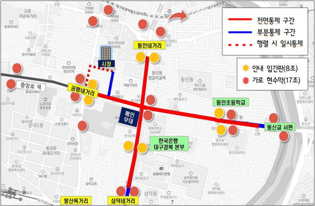 한편 행사 당일 오후 10시 30분부터 다음날 오전 1시 30분까지 동인네거리~삼덕네거리, 공평네거리~동신교 서편 구간이 전면 통제된다.