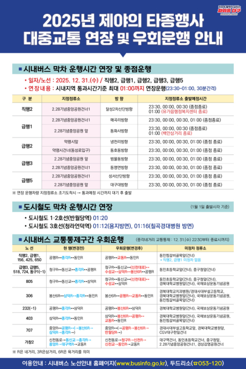 행사장 인근을 통과하는 시내버스 18개 노선은 오후 10시 30분 이후 행사장을 우회 운행하고, 직행 1개 노선과 급행 4개 노선은 오전 1시부터 시내를 통과한다. 도시철도는 반월당역과 명덕역, 청라언덕역에서 막차 운행시간을 다음날 오전 1시 10~20분으로 연장한다.
