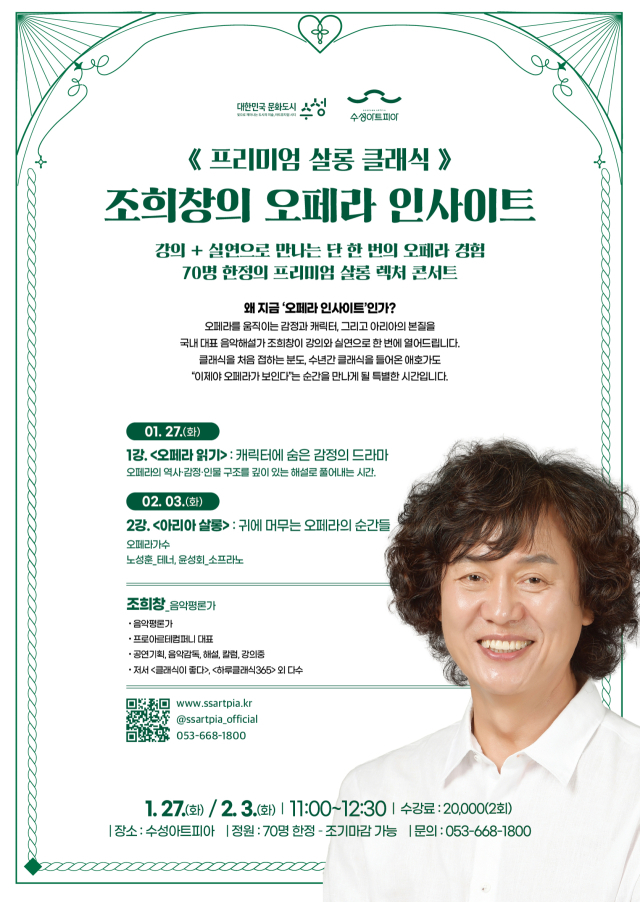 수성아트피아는 내년 1월부터 2월까지 두 달간 운영되는 겨울특강 수강회원을 모집한다. 미술, 클래식, 인문학 등 다양한 예술 장르를 한자리에서 만날 수 있는 특강으로 프로그램의 완성도를 높였다.