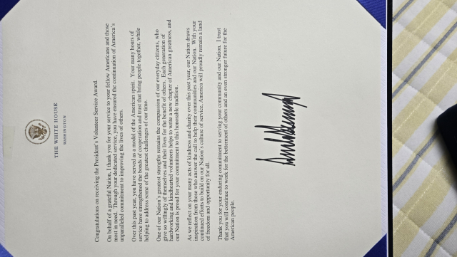 또한 백악관 문장이 새겨져 있고 트럼프 대통령의 서명이 들어 있는 편지에는 "미국을 대표하여 동료 미국인과 가장 도움이 필요한 사람들을 위해 봉사해주신 것에 감사드린다. 지난 한 해 동안 여러분들은 미국 정신의 모범이 되어 주었다. 여러분들의 오랜 봉사는 사람들을 하나로 모으는 협력과 신뢰의 유대를 강화하는 동시에 우리시대의 가장 큰 과제를 해결하는데 도움이 되었다. 이런 영광스러운 전통에 대한 여러분의 헌신에 경의를 표한다. 봉사문화의 전통을 만들기 위한 여러분의 이어지는 노력 덕분에 미국은 모두를 위한 자유와 기회의 땅으로 남을 것이다. 지역사회와 우리나라를 위해 지속적으로 헌신해 주셔서 감사하다"고 적혀 있다.