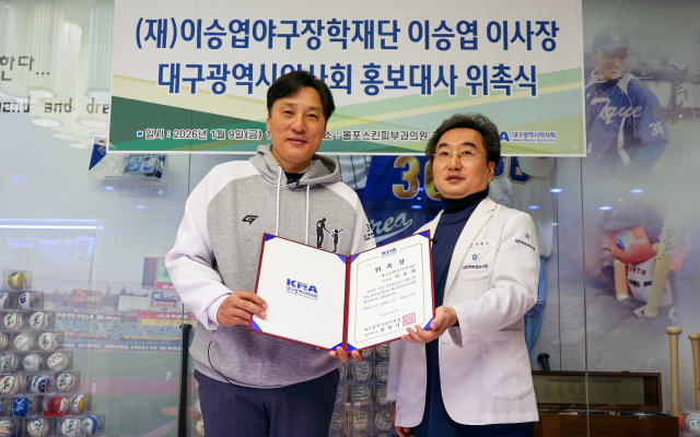 9일 대구 중구 동성로 올포스킨피부과의원에서 (재)이승엽야구장학재단 이승엽 이사장(왼쪽)이 대구시의사회 민복기 회장으로부터 위촉장을 전달 받은 후 사진을 찍고 있다. 이날 대구시의사회 홍보대사로 위촉된 이승엽 이사장은 대구시민의 건강증진과 사회공헌 등 다양한 활동에 참여하게 된다. 김영진 기자 kyjmaeil@imaeil.com
