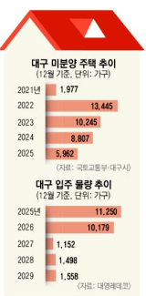 다만, 일각에서는 여전히 준공 후 미분양 물량이 적지 않다 보니 회복 국면에 들어갔다고 판단하기는 이르다는 지적도 나온다. 12월 말 기준 대구 준공 후 미분양 물량은 전월(3천719가구)보다 709가구 감소한 3천10가구로 집계됐다.