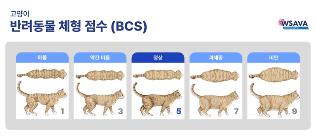 세계소동물수의사협회(WSAVA)는 이러한 문제를 보다 직관적으로 예측할 수 있도록 BCS(Body Condition Score, 체형 점수) 지표를 제시하고 있다. 1부터 9까지의 점수로, 4~5는 이상 체중, 6~7은 과체중, 8~9는 비만이다. 정상 체형은 갈비뼈가 손으로 잘 만져지고, 위에서 보았을 때 허리가 들어가 있으며, 옆에서 보았을 때 배가 살짝 올라가 있는 상태다. 반대로 갈비뼈가 만져지지 않고 허리선이 사라졌다면 이미 비만에 가까운 단계다.