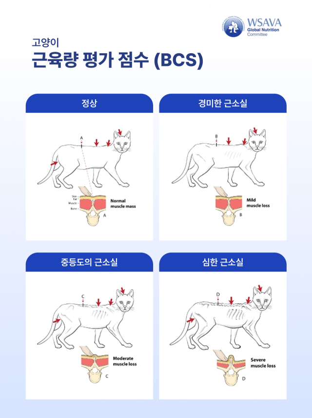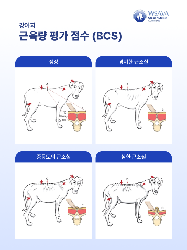 세계소동물수의사협회(WSAVA)는 여기에 더해 MCS(Muscle Condition Score), 즉 근육 상태 평가도 함께 확인할 것을 권고한다. 등과 다리 근육을 촉진해 근육 소실 정도가 정상, 경미한 근소실, 중등도 근소실, 심한 근소실의 네 단계로 나누고 있다.
