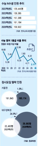실제 한국교육과정평가원이 발표한 '2025학년도 수능 성적 분석 결과'에 따르면 N수생의 국어·수학 표준점수 평균은 각각 108.9점, 108.4점으로 고3 재학생 평균보다 13.1점, 12.1점 높았다. 절대평가로 치러진 영어에서도 N수생의 1등급 비율은 9.6%로 재학생(4.7%)의 두 배를 웃돌았다. N수생이 재학생보다 유리한 구조 속에서 '재도전'의 유혹을 떨치기 어려운 상황이다.